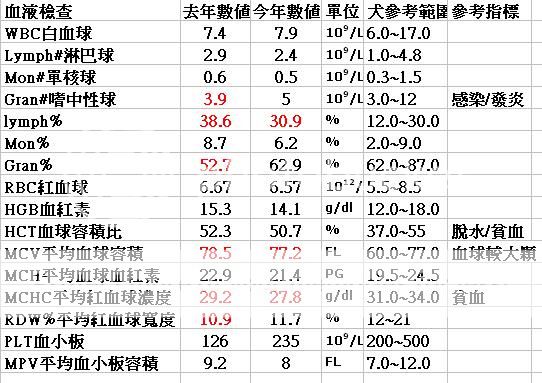 生化健檢項目 | 檢查器官 | 去年數值 | 今年數值 | 單位 | 犬參考範圍 |