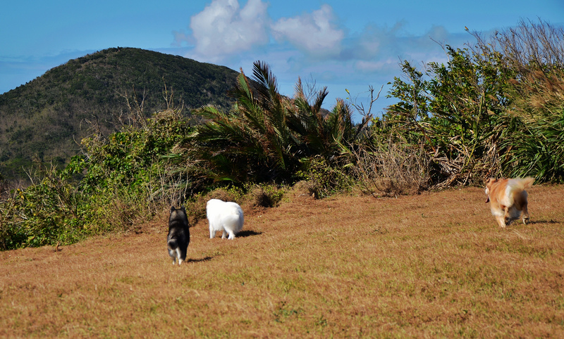 草原往海的方向面去 周圍有圍欄延伸到左邊的椰子樹